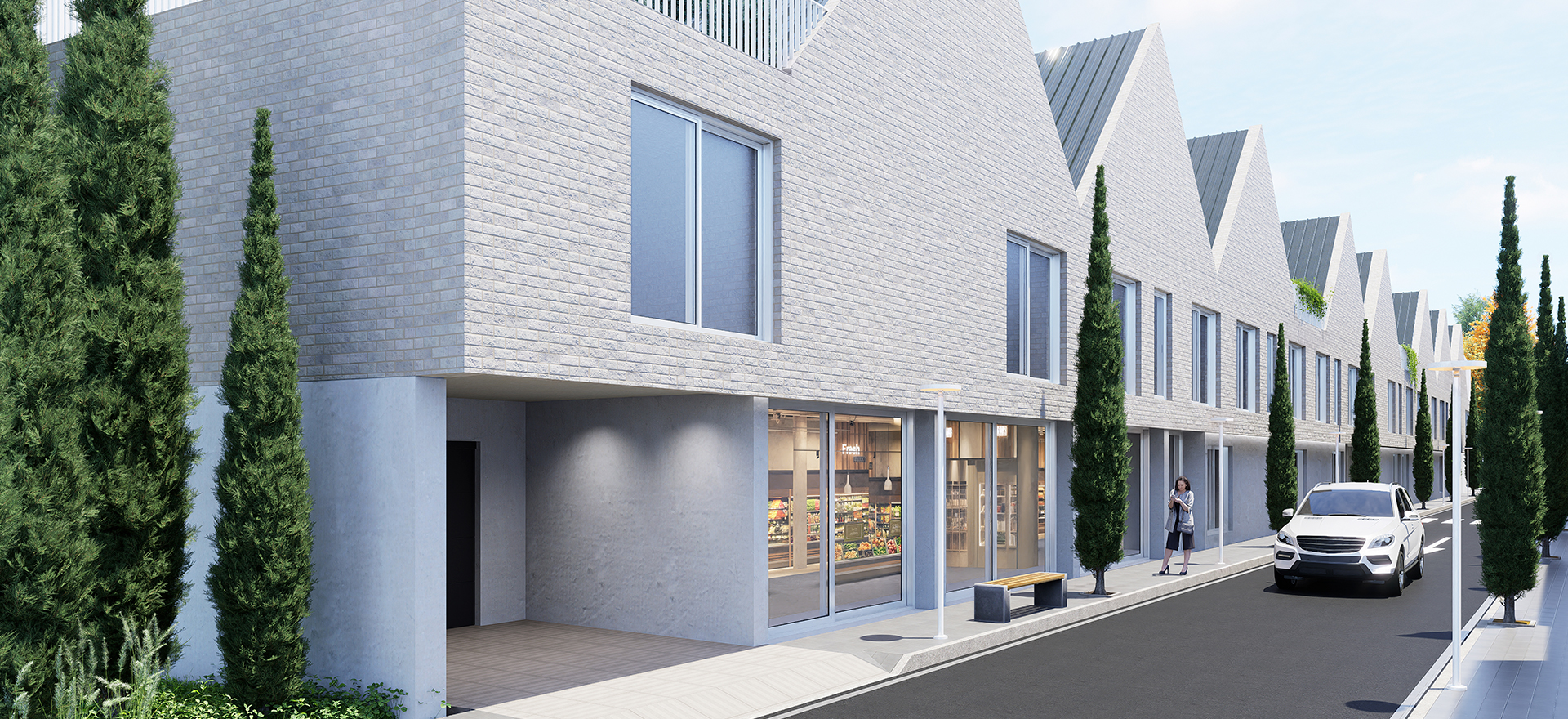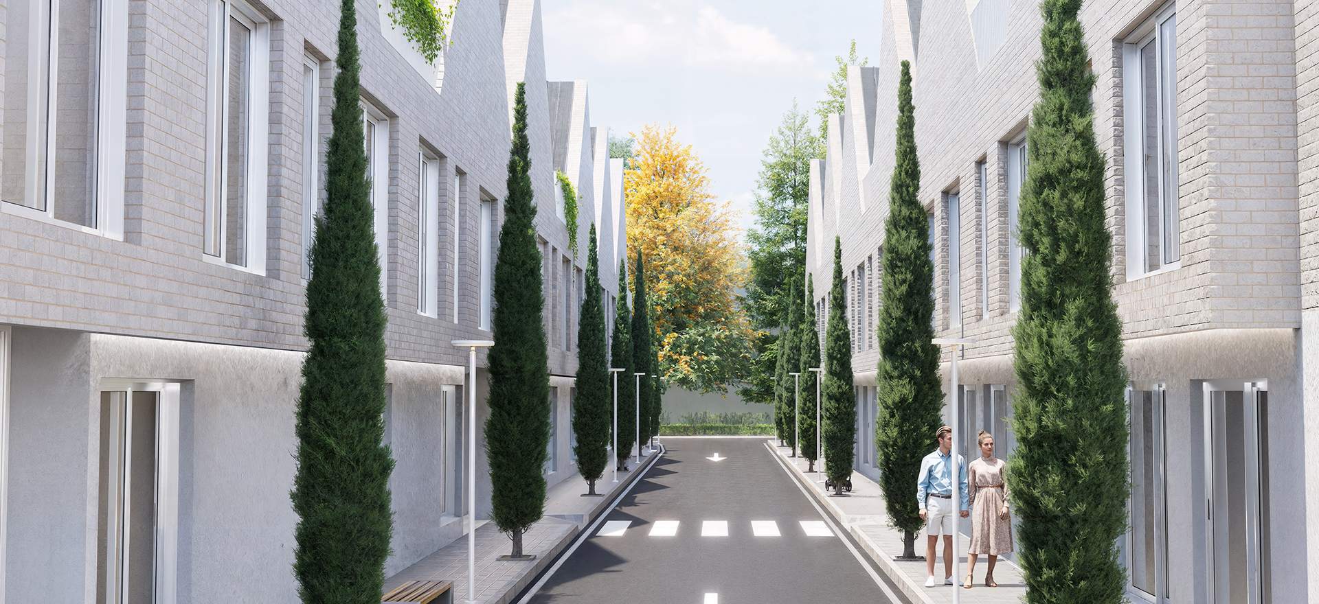 Aunque se trata de un edificio plurifamiliar, la arquitectura juega con volúmenes, cubiertas inclinadas y una composición rítmica que recuerda a viviendas adosadas, creando una imagen amable, cercana y moderna.